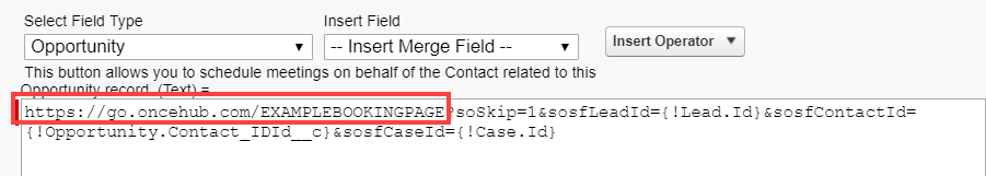 https://go.oncehub.com/EXAMPLEBOOKINGPAGE?so&Skip=1&sfLeadId={!Lead.Id}&sfContactId={!Opportunity.Contact_IDid__c}&sfCaseId={!Case.Id}
