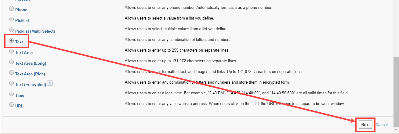 Figure 3: Fields & Relationships - In the New Custom Field pane, select Text and click Next (Figure 4).