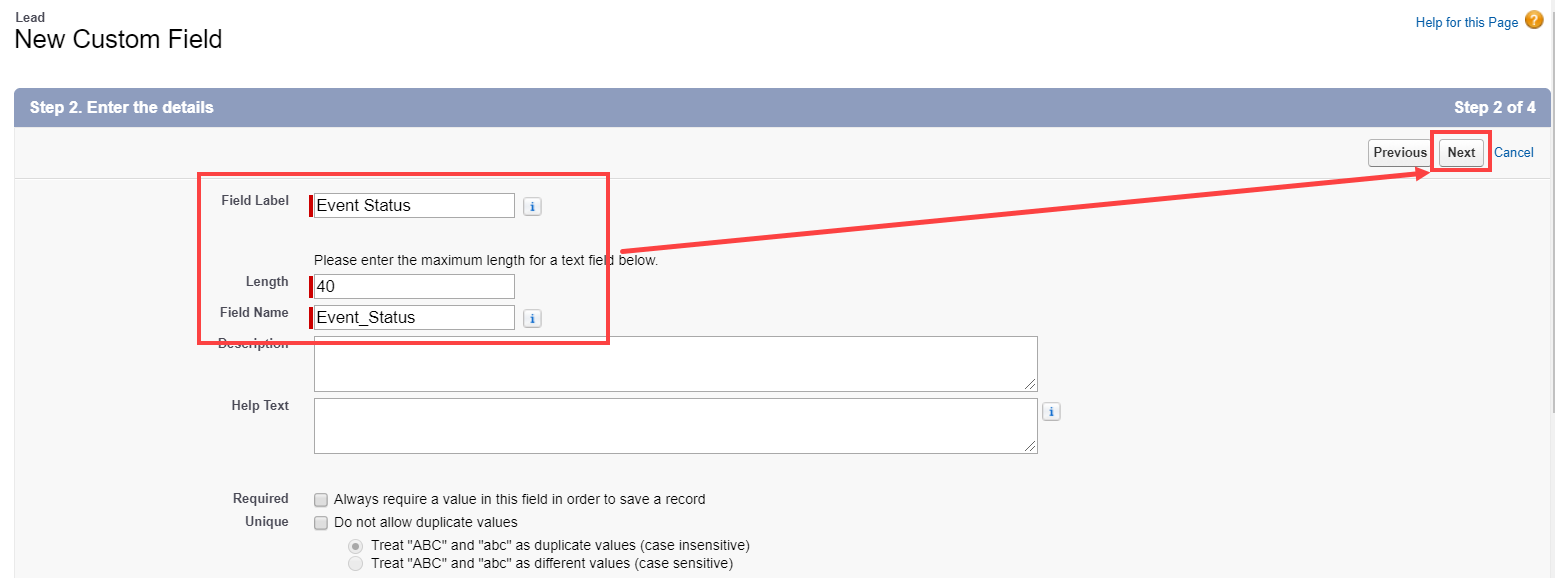 Your Event Status text Custom field is now created and is added to the Lead Page Layout.