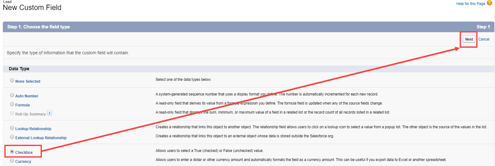 - In the New Custom field pane, select Checkbox and click Next (Figure 6).