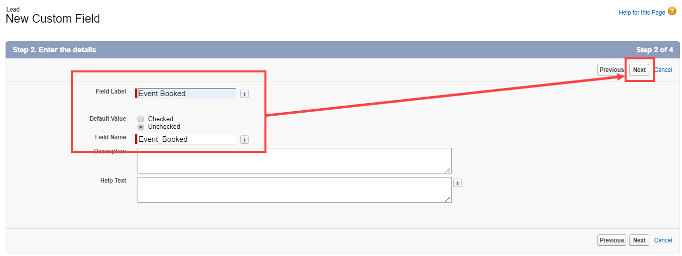 - Create an Event Booked checkbox Custom field (unchecked as default) for the Lead object and add it to the Lead Page Layout.