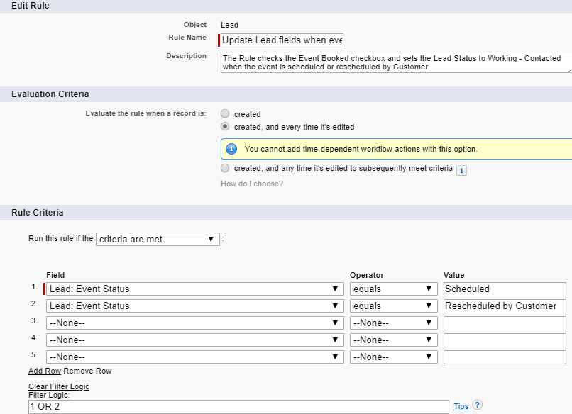 - Rule description: The Rule checks the Event Booked checkbox and sets the Lead Status to Working - Contacted when the event is scheduled or rescheduled by Customer.