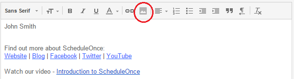 Figure 1: Picture icon in email signature editor - In the editor pane, select the newly-added button image to highlight it.
