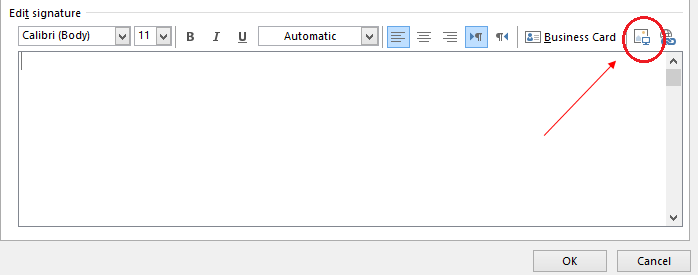 - In the email signature editor, click the Upload image icon (Figure 3) and select the file you’ve just saved.