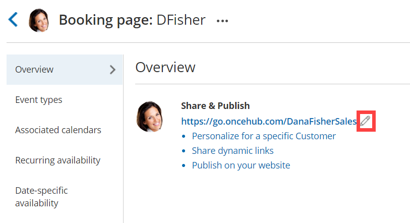 Booking page links and Master page links are used in all of OnceHub’s Share & Publish options. In some cases, you may want to change the link that Customers use, such as when a Booking page is reassigned to a different User.