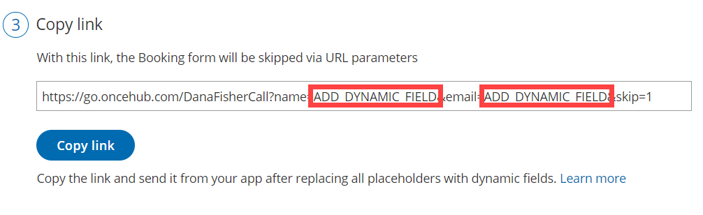 Section titled “Adding your own URL parameters”If you need to replace the ADD_DYNAMIC_FIELD placeholders (Figure 4) with your own parameters, you can copy the link to a notepad. Learn more about supported OnceHub URL parameters