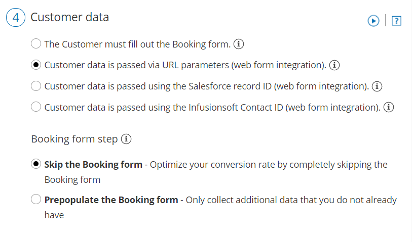In the Customer data step (Figure 3), select to have Customers fill out the Booking form, or select a web form integration option.