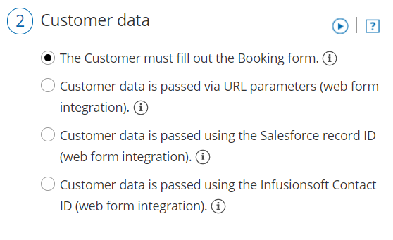 In the Customer data step (Figure 2), select to have Customers fill out the Booking form, or select a web form integration option. If you select a web form integration option, you can select to Skip the Booking form or Prepopulate the Booking form.
