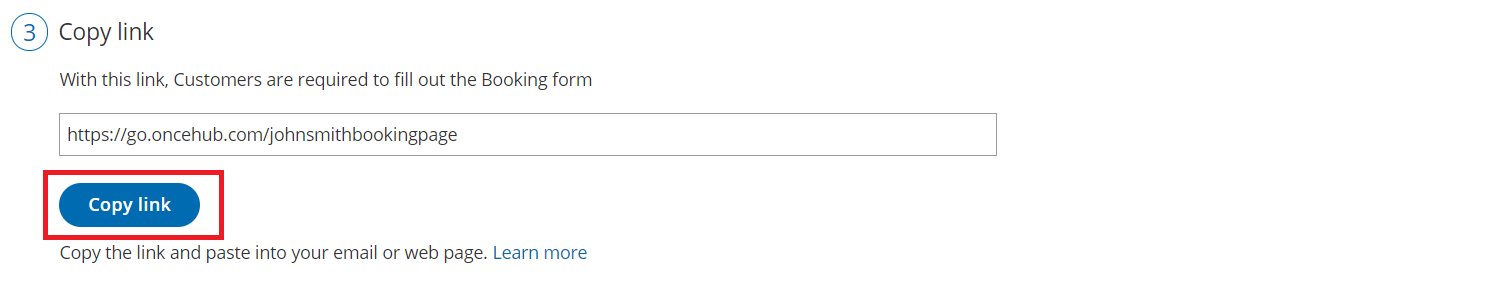 - Click the Copy link button to copy the link to your clipboard. If you want to skip the Booking form step, when you paste the link you should add the soskip parameter to the link: http:// go.oncehub.com/johnsmith?soskip=1.