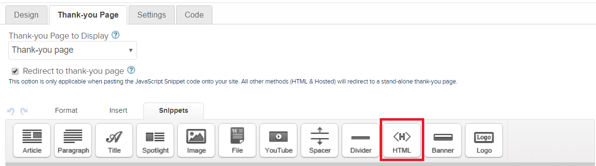 In the Snippets snippets tab (Figure 7), click and drag the HTML snippet onto the Thank-you page**.
