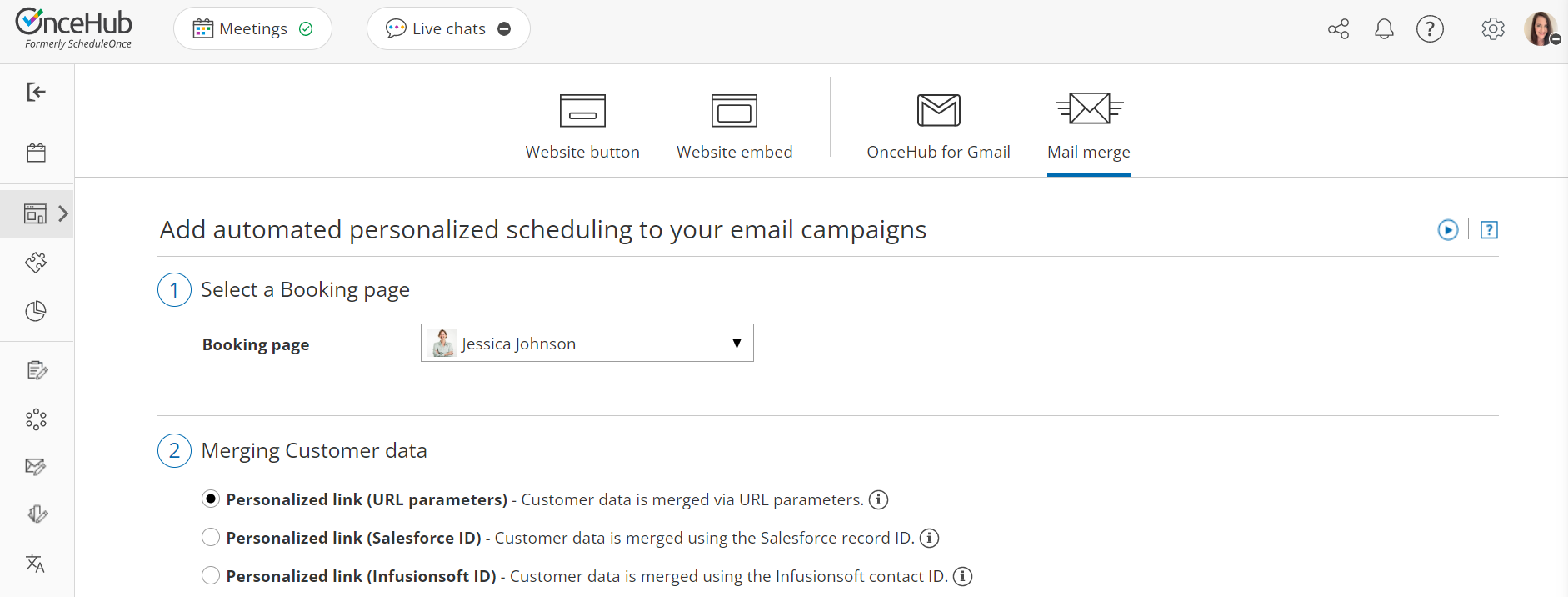 - Go to Booking pages in the bar on the left → Booking page → Share & Publish. Select the Website embed or Website button tab. In the Customer data step, select Customer data is passed using the Infusionsoft Contact ID (web form integration). Then, copy and paste the embed or button code in your landing page.