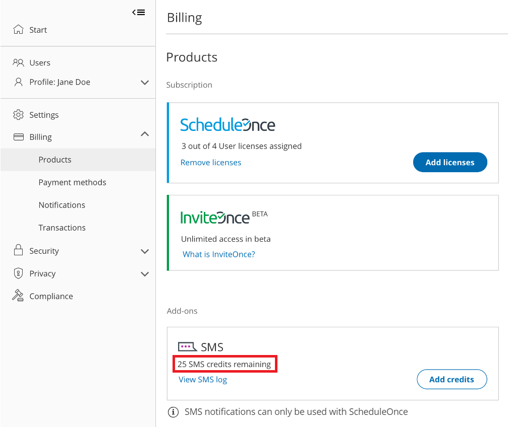 - Select your profile picture or initials in the top right-hand corner → Profile settings → **Billing → Licenses **→ SMS → View SMS log.