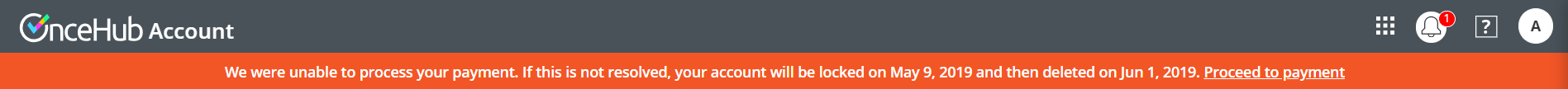 Section titled “OnceHub was unable to process your payment”If OnceHub was unable to process your payment, you will have a 7-day grace period to update your payment method. During this time, you can continue to use OnceHub as normal and Customers can still make bookings with you.