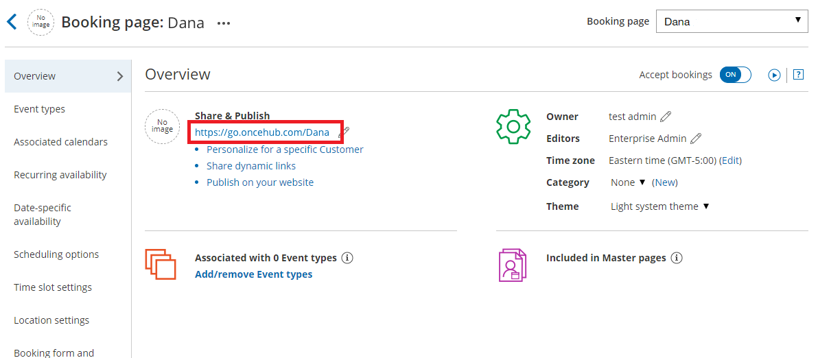 NoteAlways use the Booking page’s public link because it is unique. Do not use the Public name or Internal label because they are only unique to your account.