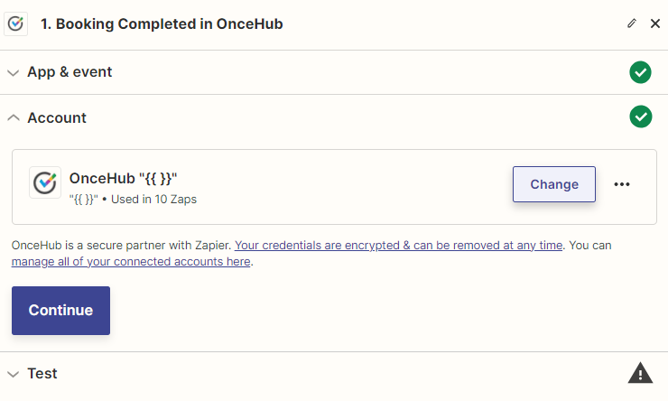 Select a OnceHub account. If you have already connected your OnceHub account with Zapier, simply select the account. Make sure to test the connection by clicking the Test button.