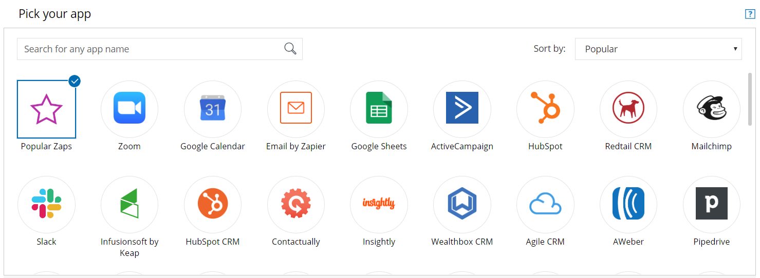 Filter the Zaps shown by selecting one or more apps in the Search area. The Zap templates are displayed below the Search area, listed by popularity by each selected app (see Figure 2).