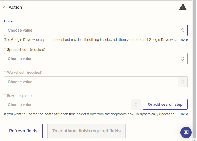 Set up the Action by filling in the fields (see Figure 8). Some fields require you to select values from the Action app, while other fields require you to use your own text and/or values from OnceHub fields. Click on a field’s drop-down to see which options are available. Use the Search bar at the top of the dropdown to search for a specific field. Values from OnceHub fields will be dynamically updated with the relevant booking data and customer data each time the Zap is triggered. In the example below, you have to choose a Google Sheet for Zapier to populate.