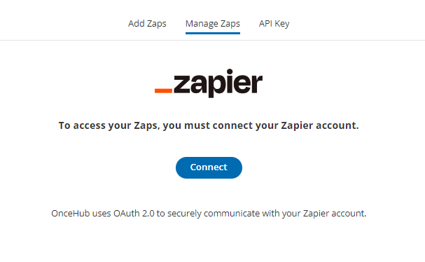 Section titled “Requirements:”To access your OnceHub Zaps from within OnceHub, you need a Zapier account.