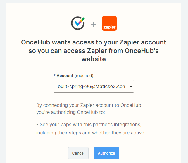 In the Zapier consent screen (see Figure 2), click Authorize to allow OnceHub to list your Zaps and their statuses. You will be redirected back to OnceHub.