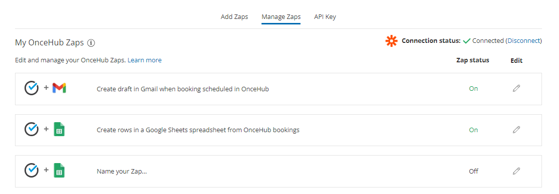 Section titled “Managing Zaps from within OnceHub”The OnceHub connector for Zapier allows you to manage your OnceHub Zaps from within the comfort of your OnceHub account. OnceHub communicates with the Zapier API to retrieve a list of your OnceHub Zaps and their statuses.