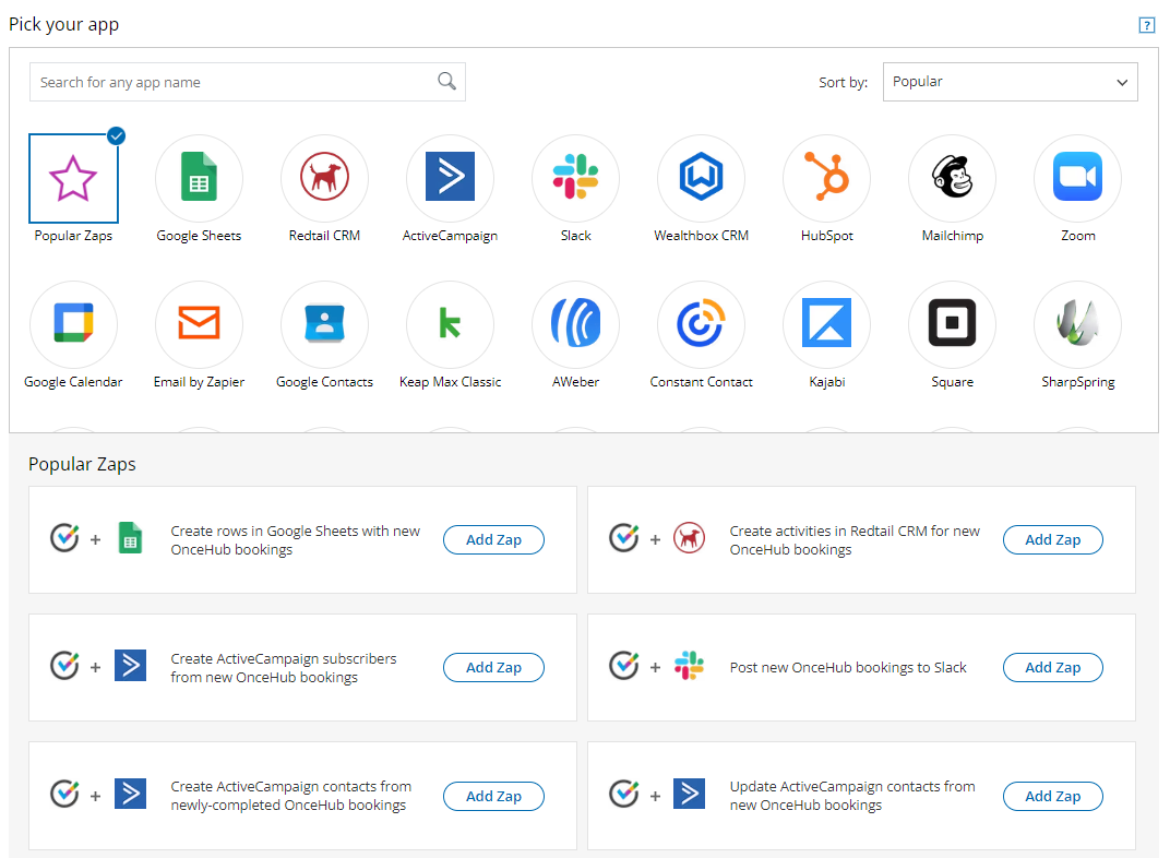 Select the Add Zaps tab. Here, you can search for apps with Zap templates to connect with OnceHub. By default, the Popular Zaps category is selected, showing you the most popular Zaps used by OnceHub Users (Figure 1).