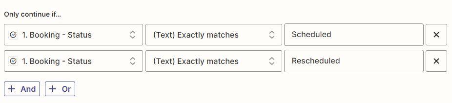 Section titled “How to add a Filter step to a Zap in Zapier”A Filter is an optional step in a Zap that allows you to control when a Zap is triggered. You can define rules that state whether the Zap Action should be performed. For example, if you have multiple Booking pages, you can define a filter that states the Zap should only be triggered on specific Booking pages. Another option is to create filters that state the Zap should only be triggered upon specific booking events (e.g. Scheduled and Rescheduled).