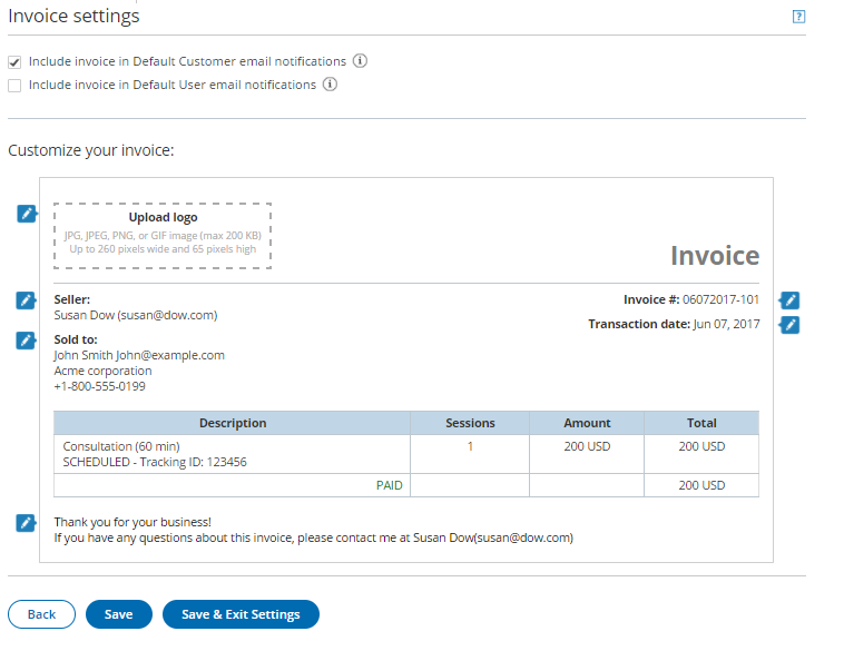 - Include invoice in Default User email notifications: You can choose to add the invoice to User notifications. When checked, invoices for payment transactions will be automatically added to default scheduling and rescheduling confirmation emails sent to the User. Credit invoices for refund transactions will be automatically added to default cancellation emails sent to the User. Learn more about notification scenarios