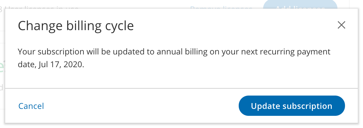 Figure 1: Change billing cycle popup - This example changes the cycle from monthly to annual
