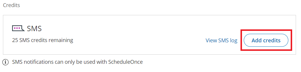 Section titled “Purchasing and managing SMS credits”SMS notifications are purchased in packages of credits. You can purchase SMS credits in your OnceHub Account in the Billing→ Seats section. Once you’ve purchased SMS credits, they are immediately available for use by every user with a user seat. SMS credits are deducted per SMS notification sent.