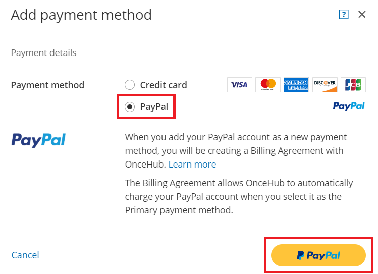 Section titled “Adding a PayPal Account”The Billing Agreement is an agreement between you and OnceHub which allows OnceHub to automatically charge your PayPal account for purchases made in your OnceHub Account. The Billing Agreement is handled entirely by PayPal.