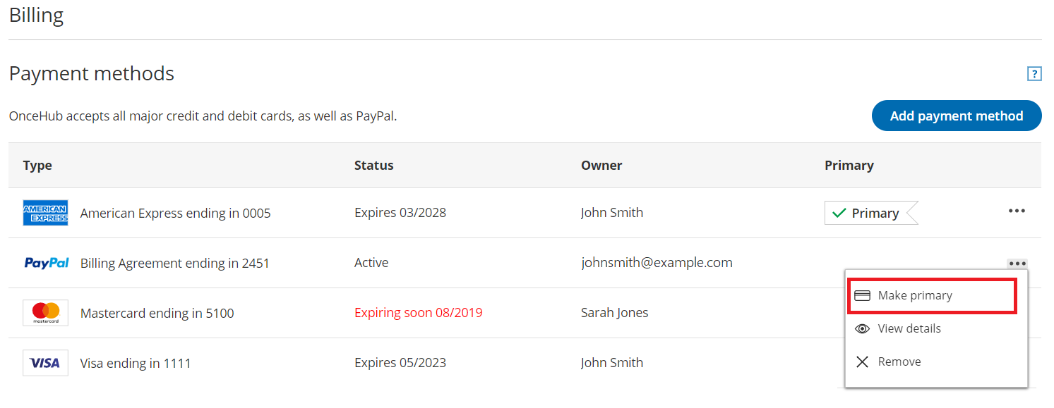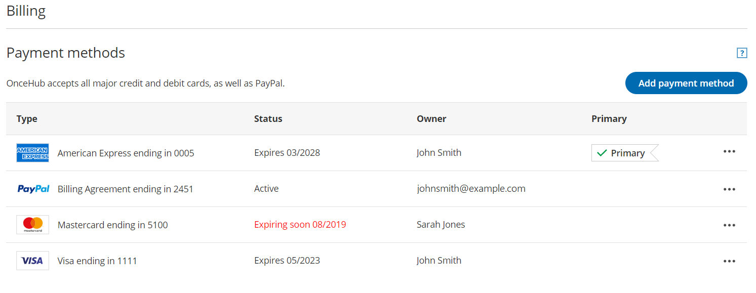 Section titled “Managing payment methods”Primary payment methods and secondary payment methods are stored in your OnceHub Account in the Billing → Payment methods section. You can add or remove payment methods at any time. You can also change the primary payment method as needed.