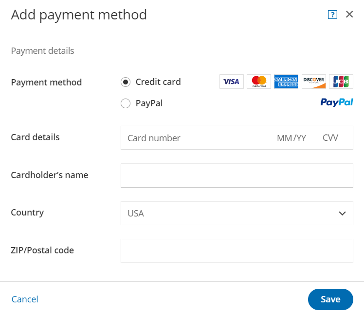 Section titled “Primary payment method”When you purchase a product for the first time, the payment method you use is stored as the primary payment method in the Billing → Payment methods section of your OnceHub Account. You can only have one primary payment method at a time.