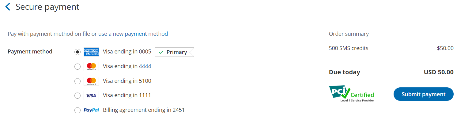 Section titled “Using a payment method on file to make a one-off purchase”When you make a one-off purchase on your OnceHub Account, such as purchasing SMS credits, you can choose to pay with a payment method you have already added or pay with a new payment method (Figure 4).